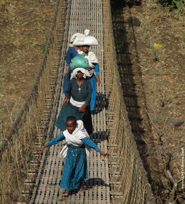 Склепани „олтари“ од лима, камења и прућа, са иконама и свећама, чувају прелаз од злих духова. Док су на пијаци сви згурани и ужурбани, мост полагано и опрезно пролазе један по један. Имам прилику да осмотрим сваког човека понаособ док се лагано љуља на висећем мосту изнад провалије где жубори вечни Нил. Дечак на штапу преко рамена носи везане живе кокошке, читав кокошињац; жене у белим и мушкарци у плавим тогама, девојке што на главама носе џакове, канте и корпе пуне робе, а са врха брда спустише се и они момци с тешким теретом…