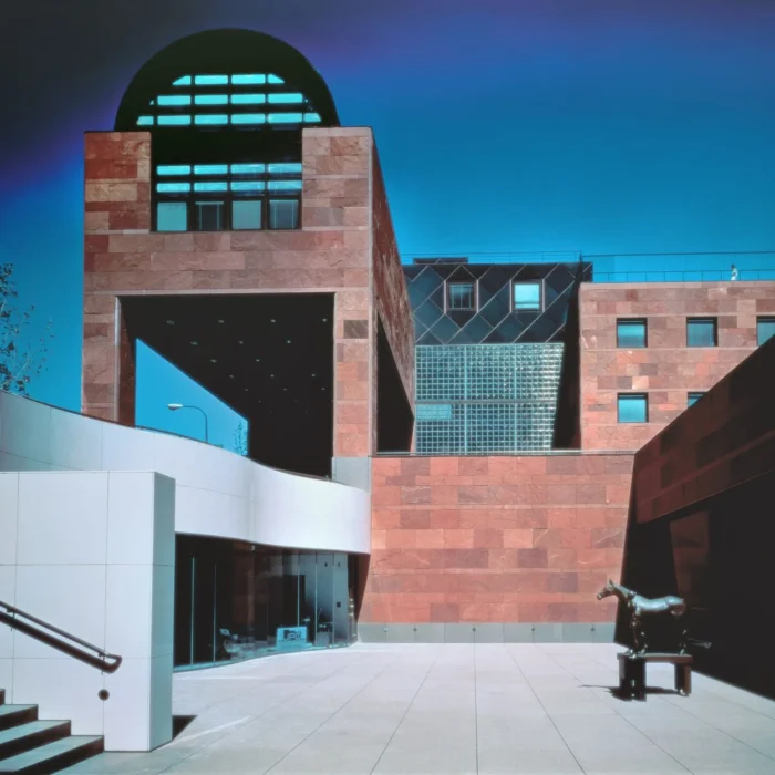 Objekat je projektovan kao niskospratni muzej u kontrastu sa okolnim neboderima. Isozakijev dizajn uključuje fasadu od crvenog indijskog peščara i delimično podzemni raspored: četiri od sedam nivoa uzdižu se iznad ulice, dok se ostatak galerija nalazi pod zemljom.