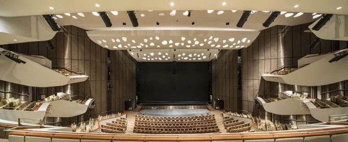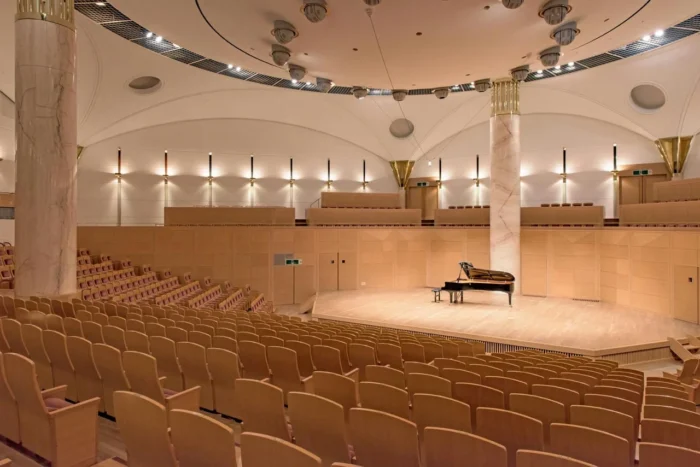Unutrašnjost centra obuhvata veliku dvoranu sa 4.000 mesta, više manjih sala, izložbene prostore i multifunkcionalne prostore za konferencije, kulturne događaje i međunarodne skupove. Isozaki je ovde spojio tehnološku sofisticiranost i simboličnu arhitekturu, naglašavajući kulturni značaj objekta za Katar.