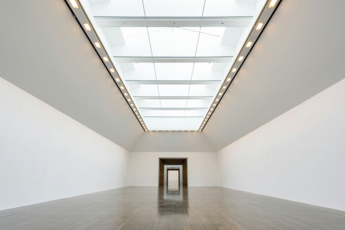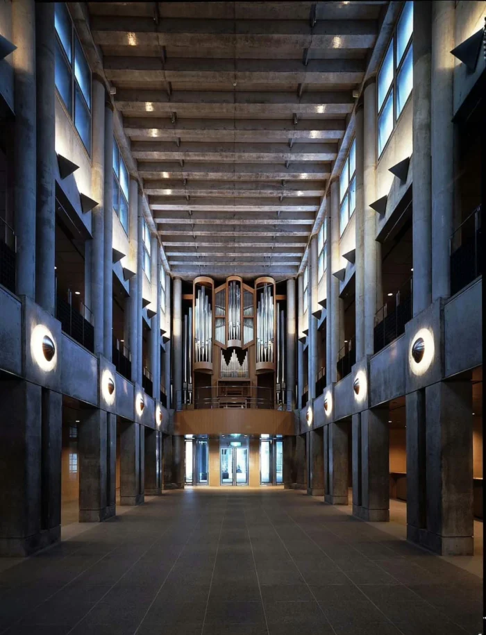 Materijali — pretežno grubo obrađeni crveni peščar i beton — daju muzeju masivan i postojan izgled. Unutrašnje galerije osvetljene su piramidalnim krovnim prozorima koji propuštaju prirodnu svetlost u podzemne izložbene prostore.